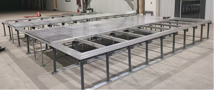(2) 设备支架兼顾周边防静电地板的铺设,组装好的设备支架周边预留有地板支撑平台,且设备支架与地板支架可方便连接地板横梁,与地板支架形成一体化架构,整体铺装平稳、安全,地板开启方便,便于机柜地板下空间的维护、布置;